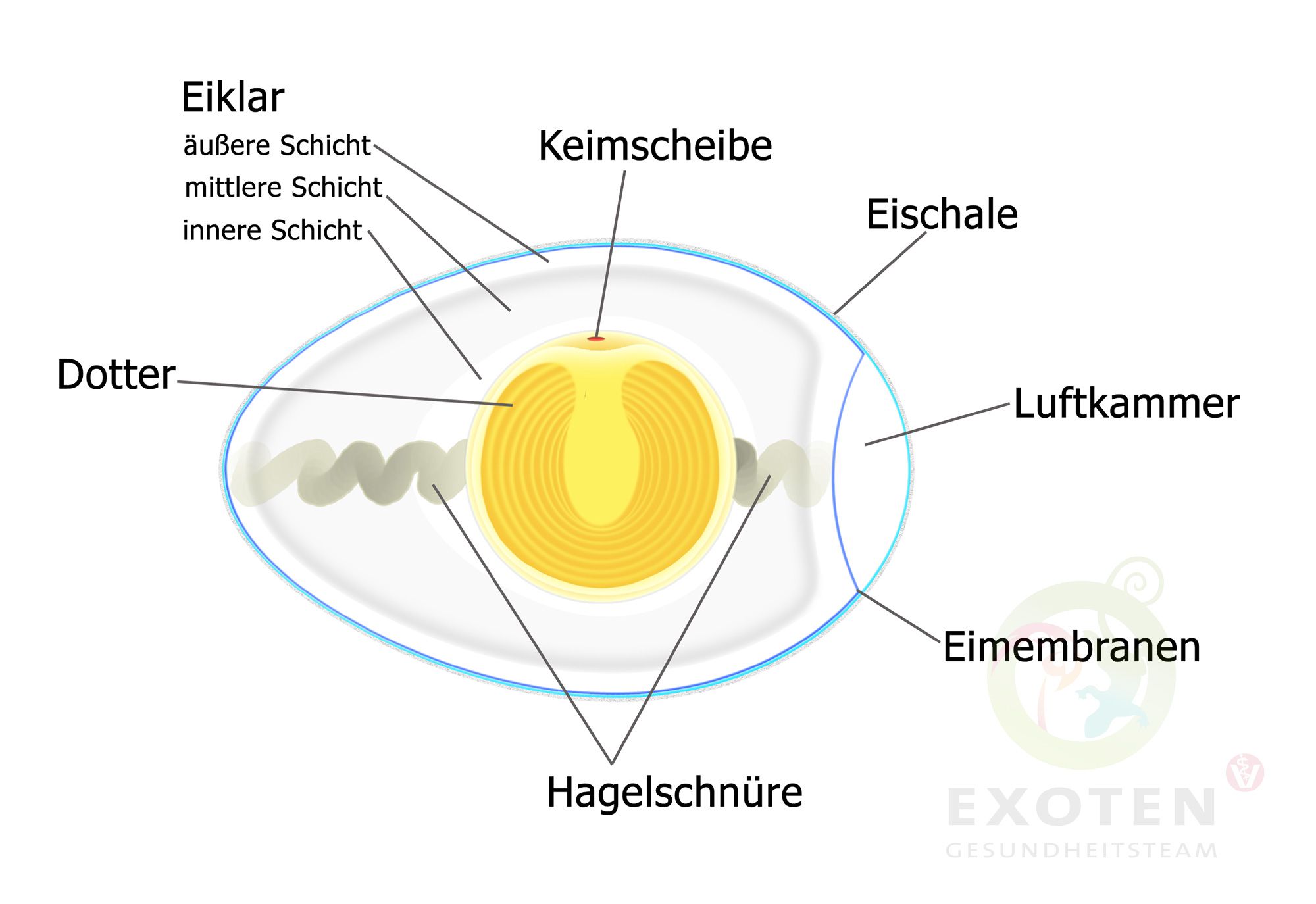 Der Grundaufbau der Eizelle ist bei vielen Tieren -nicht nur Vögeln- ähnlich.An die weibliche Eizelle oder auch Keimzelle angegliedert befinden sich Nahrungs- und Flüssigkeitsreserven die von unterschiedlichen Häuten und Hüllen umgeben sind.