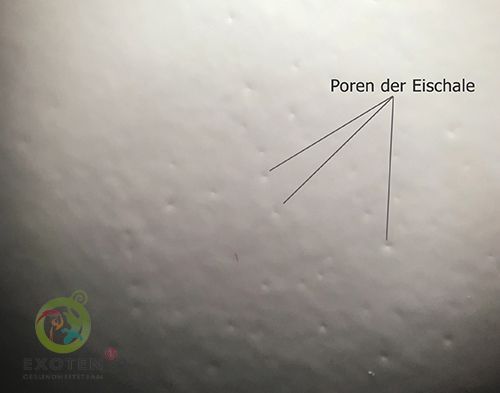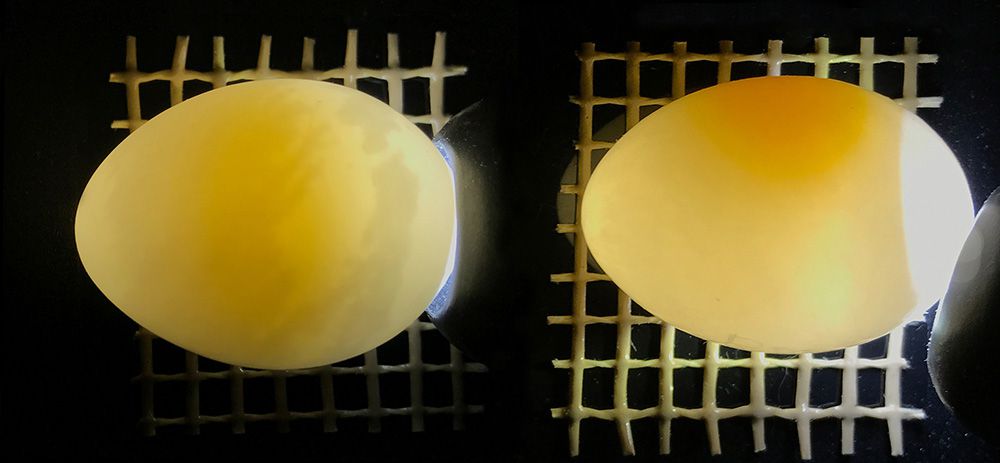 Beim Schieren der Eier sieht man deutlich die Größe der Luftkammer. Sie ist ein wichtiger Indikator für den Flüssighaushalt des Eies. Hier im Vergleich ein frisch gelegtes Ei bei dem sich noch keine Luftkammer gebildet hat (links) im Vergleich zu einem bereits älterem Ei mit Luftkammer (rechts).
