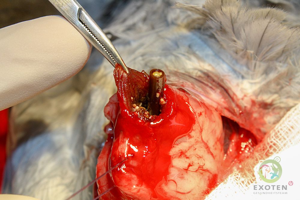 Während des Eingriffes wurde die Bauchhöhle eröffnet und der Muskelmagen vorgelagert. Nun wurde dieser eröffnet um den Fremdkörper bergen zu können. Der Muskelmagen war stark mit Körnern gefüllt, da eine adequate weitere Passage der Nahrung durch den Fremdkörper verhindert wurde. Nachdem die Körner entfernt wurden, konnte der Fremdkörper mit einer Pinzette geborgen und entfernt werden.