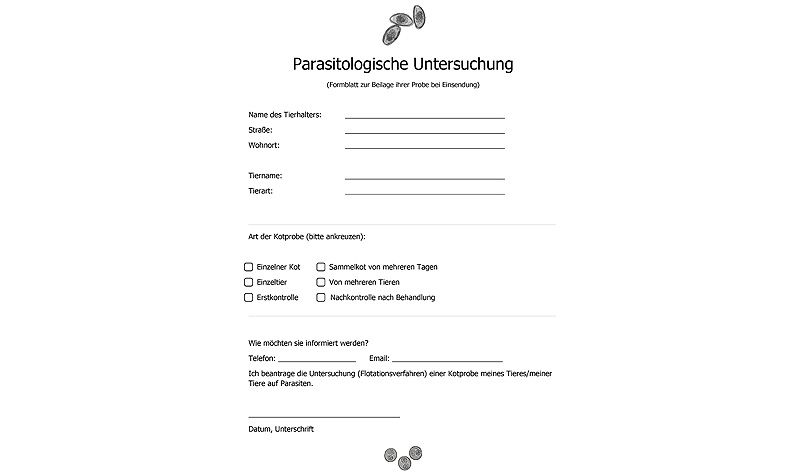 Ihnen ist der Weg in unsere Praxis zu weit oder sie möchten sich die Fahrt sparen? Gerne können sie eine Kotprobe ihres Tieres oder Bestandes zur parasitologischen Untersuchung zu unserer Praxis schicken. Nutzen sie hierzu einfach unser Downloadformular und legen sie es beim Versand ihrer Probe bei. Wir führen dann die gewünschten Untersuchungen durch. Selbstverständlich können sie uns auch für auftretende Fragen vorab telefonisch in unserer Praxis kontaktieren.