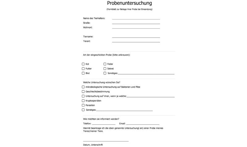 Zu einigen Fragestellungen ist die Untersuchung verschiedener Probenarten nötig. Dies können Federn, Eischalen, Futterproben oder Ähnliches sein. Auch die Art der gewünschten Untersuchung ist oft sehr unterschiedlich (z.B. Untersuchung auf Viren, Geschlechtsbestimmung, einfache Begutachtung etc.). Nutzen sie einfach unser Downloadformular und legen sie es beim Versand ihrer Probe bei. Haben Sie hierzu Fragen könnnen sie uns gerne in unserer Praxis vorab kontaktieren.