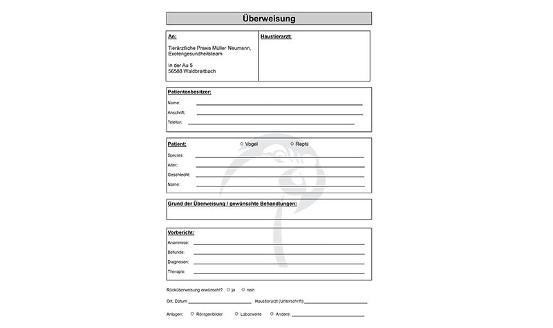 Sie möchten ihren Patienten gerne an uns Überweisen? Gerne übernehmen wir die (weitere) Behandlung ihres Patienten. Hierzu können sie dieses Überweisungsformular zur Hilfe nehmen.