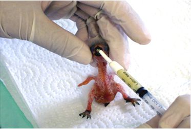 • Während der Fütterung den Kopf stets in aufrechter Position halten und eine Rückenlage vermeiden. Rechts im Bild die Fütterung eines jungen Neuguinea-Edelpapagei (Eclectus roratus polychlorus).