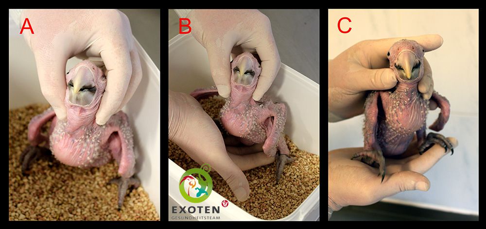 • Papageienküken sollten stets in aufrechter Position hochgehoben werden (siehe Bild). Der Kopf wird dabei mit einer Hand fixiert (A) und der Jungvogel mit der anderen Hand aufgenommen (B und C).