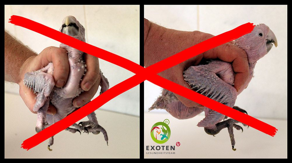 In der Handaufzucht von Papageien kommt es gelegentlich zu lebensbedrohlichen Unfällen, die auf einen nicht fachgerechten Umgang mit den Nestlingen zurückzuführen sind. Beachtet man aber einige Richtlinien, können diese durch falsches Handling verursachten Probleme mit fatalen Folgen weitgehend vermieden werden.