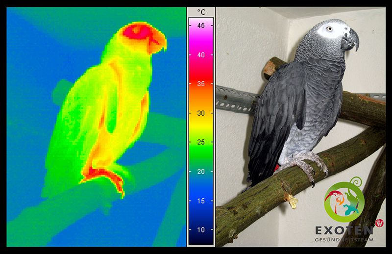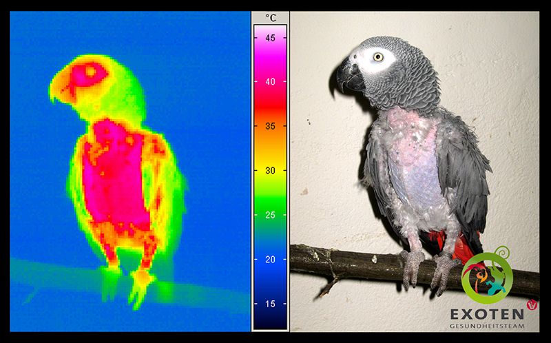 Die wichtige isolierende Funktion des Gefieders fehlt bei Papageien mit einer auftretenden Rupferproblematik. Während gerupfte Vögel bei Indoorhaltung und Raumtemperaturen weniger Probleme mit der Umgebungstemperatur haben, kann dies bei einer Haltung in Außenvolieren, gerade in der kälteren Jahreszeit, zu Problemen führen. Hohe Wärmeverluste müssen über eine hohe Energiezufuhr, sprich hohe Futtermengen, kompensiert werden. Gelingt dies nicht, kommt es zur Unterkühlung und erhöhten Krankheits-anfälligkeit gegenüber den normalbefiederten Artgenossen. Hier im Beispiel des Graupapageien (Psittacus e. erithacus) erkennt man als am meisten Wärme abstrahlende Bereiche die nackte Gesichtshaut sowie die Füße. Auf der Aufnahme des rupfenden Tieres erkennt man die hohen Wärmeverluste im Bereich der gerupften Areale. Hier fehlt die Isolierung des gesamten Brustbereiches völlig. Die Energiemengen, die dieses Tier bei Haltung in kühleren Temperaturen verlieren würde kann man nur erahnen. Auf den Bildern der beiden Graupapageien erkennt man jeweils einen wärmeren Fuß. In beiden Fällen war der Fuß bis kurz vor der Aufnahme in Ruheposition ins Gefieder eingezogen. Auch hier erkennt man schnell die Parallele zu Papageien, die bei kühlen Temperaturen häufiger als sonst mit einem eingezogenen Fuß auf der Stange sitzen – offensichtlich um ihn zu wärmen und den Energieverlust zu minimieren.