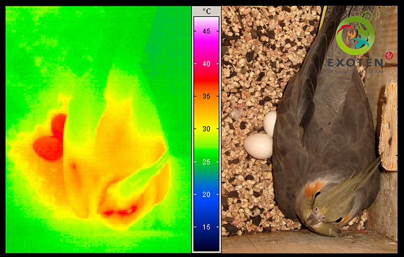 Im Wärmebild einer brütenden Nymphensittichhenne (Nymphicus hollandicus) erkennt man die isolierenden Eigenschaften des Gefieders sowie die Oberflächentemperatur der bebrüteten Eier. Die seitlich sichtbaren Eier lagen bis unmittelbar vor der Aufnahme unter der brütenden Henne, um möglichst keine Verfälschung der Oberflächentemperaturen zu erlangen. Die Oberfläche des Rumpfgefieders liegt bei Temperaturen zwischen 30 und 35°C während die Bereiche der Schwung-/Schwanz-/ und Haubenfedern nahezu Umgebungstemperaturen annehmen. Die wärmsten Oberflächentemperaturen erkennt man erwartungsgemäß im weniger isolierten Augen- und Schnabelbereich. Die Oberflächentemperatur der bebrüteten Eier liegt zwischen ca. 36-38°C. Dies ist eine interessante Feststellung, konnte man die Eitemperaturen während der natürlichen Bebrütung bisher nur über aufwendige in künstlichen Eiern eingebaute Sensoren feststellen. Deutlich ist auch die Erwärmung des Brutsubstrates erkennbar. Sie liegt in etwa demselben Bereich wie die Oberflächentemperatur des Stammgefieders. Verlässt die Henne den Nistkasten zur Nahrungsaufnahme, Kotabsatz oder zum Brutwechsel mit ihrem Hahn, kommt es durch die Erwärmung des Untergrundes nicht sofort zur drastischen Abkühlung des Geleges, da der Untergrund noch für eine kurze Zeit seine Restwärme abgibt.