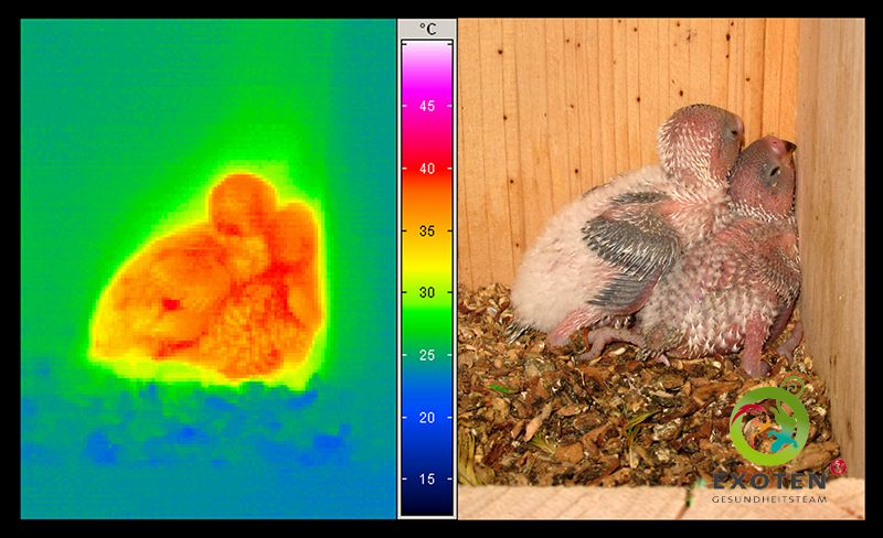 In der folgenden Aufnahme ist das Wärmebild zweier Wellensittichnestlinge (Melopsittacus undulatus) dargestellt. Man erkennt deutlich die hohe Wärmestrahlung, die von beiden Küken abgestrahlt wird. Das nur bedingt zur Isolation geeignete Flaumgefieder lässt noch erhebliche Mengen an Wärme entweichen. Die Oberfläche des Körpers erreicht zum Teil Temperaturen um 40°C. Diese, im Vergleich zu den meisten Säugetieren hohe Körpertemperaturen, stellen in der Vogelwelt den Normalwert dar. Was man bei Nistkasten-kontrollen häufig beobachten kann, lässt sich mit Hilfe der Wärmebildtechnik einfach erklären. Die Küken raufen sich zu einem Knäuel zusammen, um damit die Oberfläche zur Außenwelt zu verkleinern und damit weniger Energie in Form von Wärme zu verlieren. Diese eingesparte Energie kann schließlich zum Wachstum und damit zur schnelleren Entwicklung genutzt werden. Papageien aus kälteren Klimaten bilden zwecks besserer Isolierung daher als Nestling ein dichteres Daunenkleid, als solche aus tropischen Regionen. Ein Beispiel hierfür sind die Nestlinge der Keas zu nennen (Nestor notabilis).